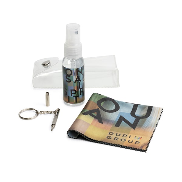 DUPI scherm/ bril reiniging setje, microfiber doekje, spray en schroevendraaiertje alles in een etui